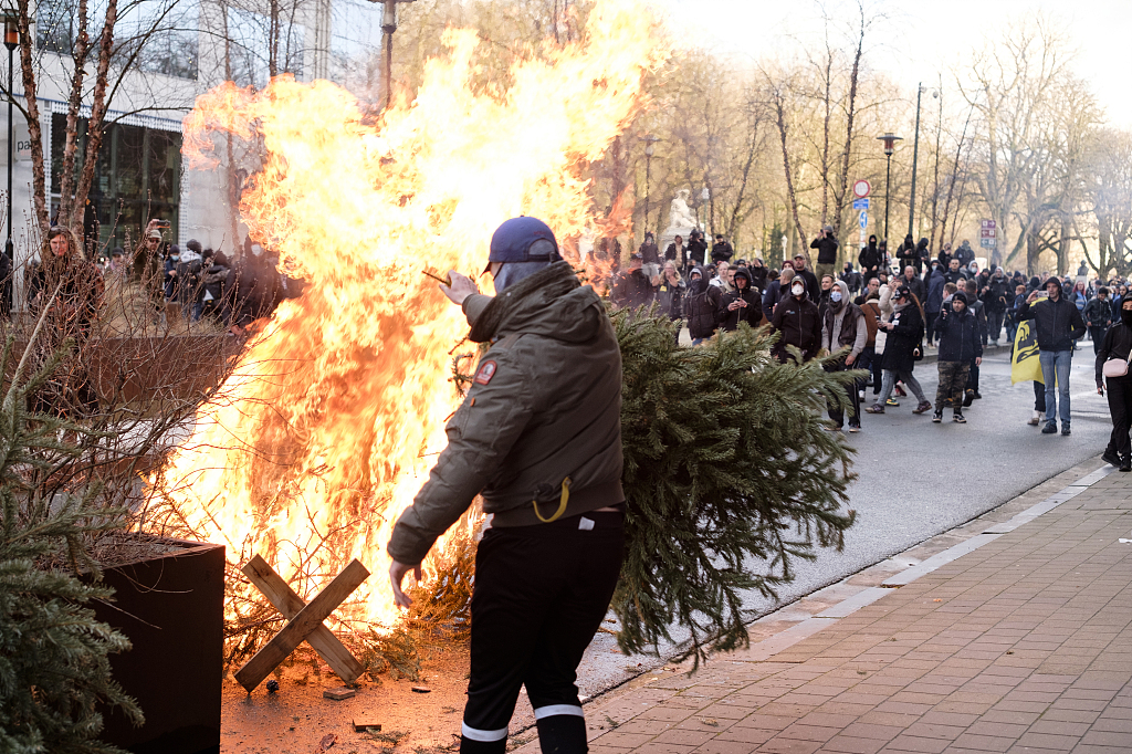 当地时间1月9日,数千名抗议者在比利时首都布鲁塞尔游行,反对新冠防疫限制规定。虽然警察介入包围了靠近欧盟总部的一小群抗议者,但并没有重演之前更大规模的示威活动中出现的暴力事件。据警察说有5000人参与抗议活动,人群穿过城市时高呼“自由,自由!”并挥舞着横幅谴责他们所称的“疫苗独裁”。游行活动开始前,警方拘留了11名被发现携带烟花的嫌疑人。警方表示,在一小群人向防暴警察扔“投掷物”后,又有30多人被捕。报道介绍,比利时要求居民出示“新冠证书”才能进入酒吧、餐馆和文化活动,导致最近发生了几起街头抗议事件。与此同时,欧洲各国政府面对奥密克戎浪潮正在考虑实施更严格的措施。图片来源:人民视觉