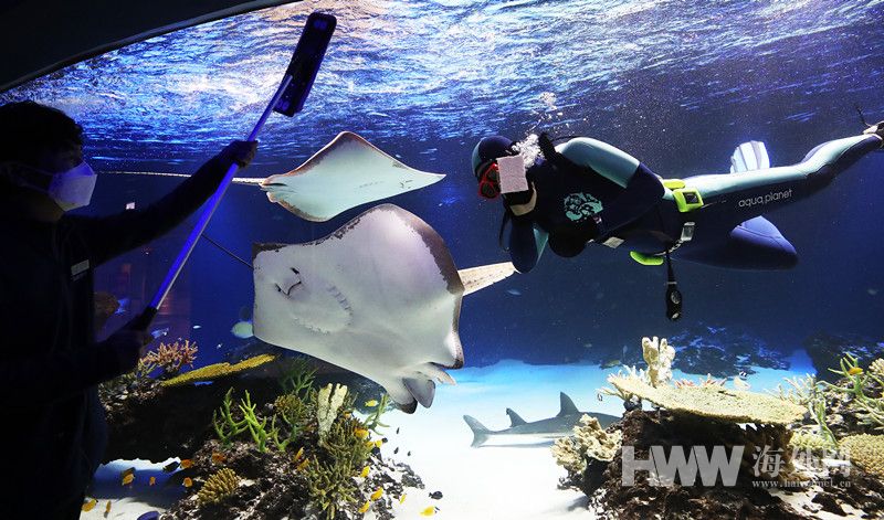 当地时间2022年1月11日,京畿道水原市,在位于灵通区的光教海水族馆,潜水员在新年到来之际清洁水槽。(图:东方IC)