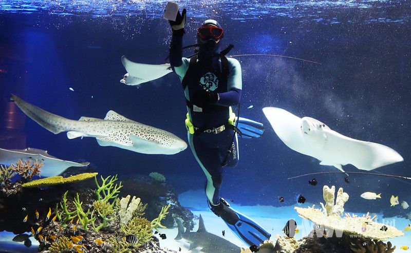 当地时间2022年1月11日,京畿道水原市,在位于灵通区的光教海水族馆,潜水员在新年到来之际清洁水槽。(图:东方IC)