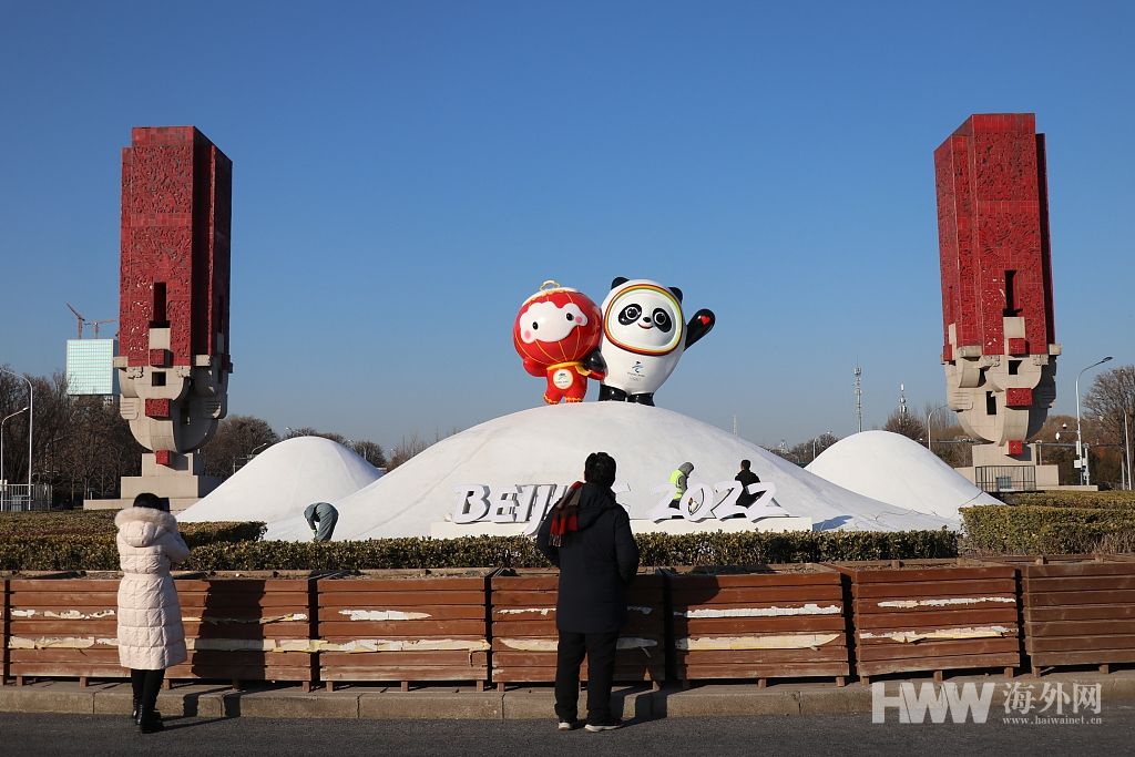 2022年1月11日,7.5米高的《盛世华章》景观小品在北京奥林匹克景观大道南端亮相。北京2022年冬奥会和冬残奥会吉祥物冰墩墩,雪容融站在雪山上向人们招手,寓意欢迎来自国内外的运动员、裁判员、嘉宾等,同享冬奥冰雪盛宴。(图:视觉中国)