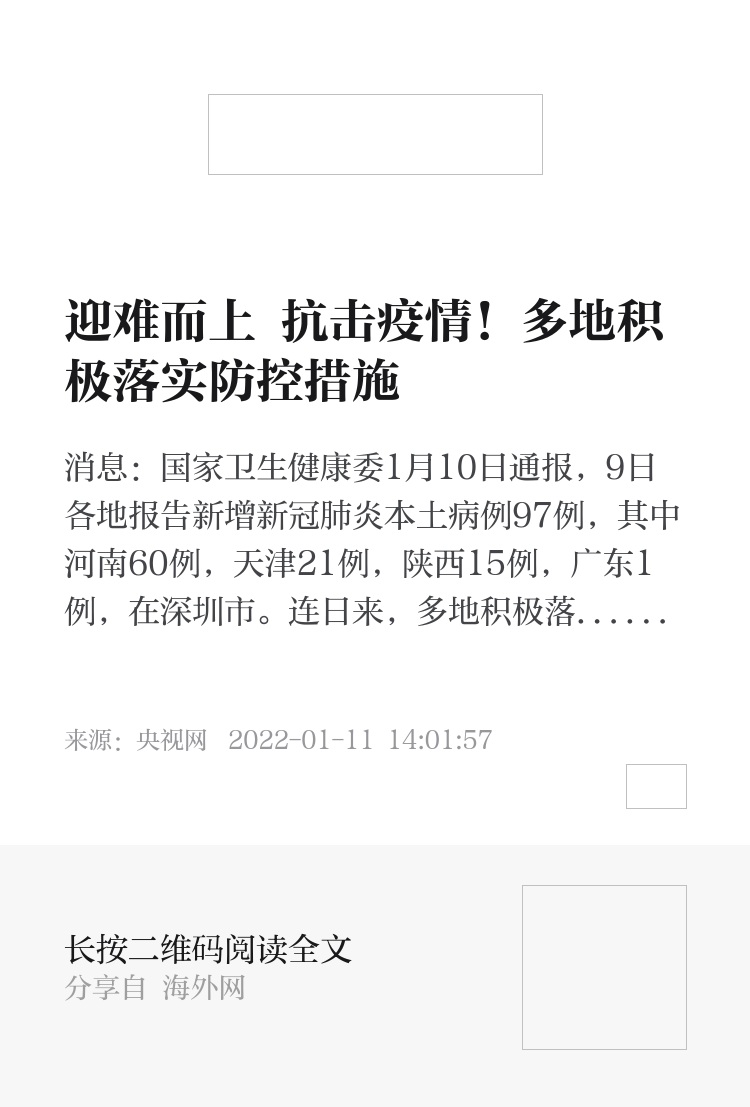央视网消息:国家卫生健康委1月10日通报,9日各地报告新增新冠肺炎本土病例97例,其中河南60例,天津21例,陕西15例,广东1例,在深圳市。连日来,多地积极落实防控措施,全力抗击疫情。