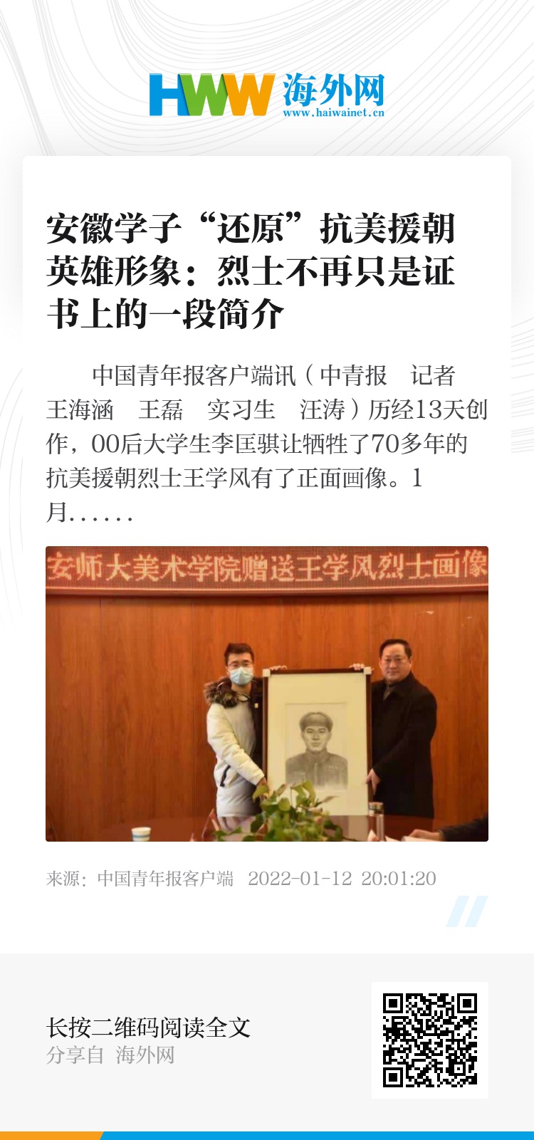 中国青年报客户端讯(中青报・中青网记者 王海涵 王磊 实习生 汪涛)历经13天创作,00后大学生李匡骐让牺牲了70多年的抗美援朝烈士王学风有了正面画像。1月11日,包括李匡骐在内的安徽师范大学美术学院部分师生,带上这幅画抵达安徽省砀山县,让王学风烈士的亲属再次见到他的音容笑貌,实现家人“面对面”重聚。