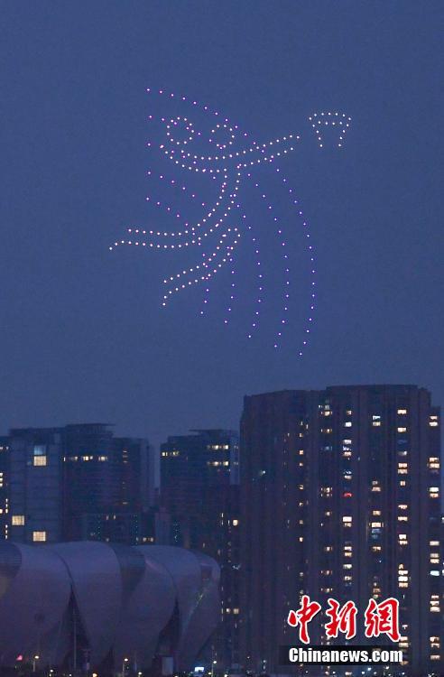 ​1月11日,浙江杭州启动第19届亚运会倒计时无人机常态化表演,亚运吉祥物、亚运火炬、倒计时等图案亮相亚运场馆上空。 中新社记者 王刚 摄