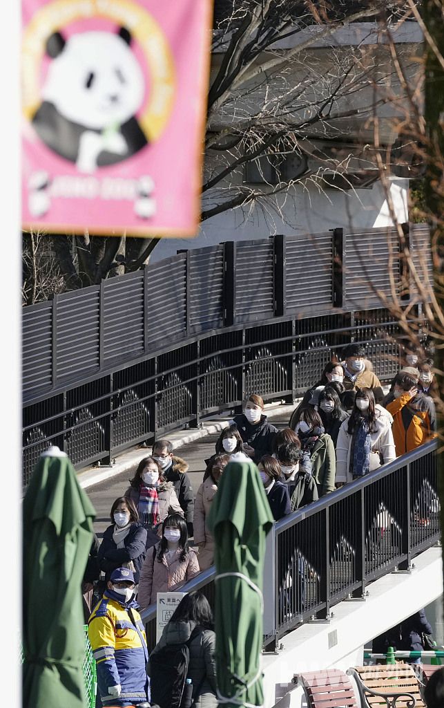 当地时间2022年1月12日,日本东京,东京上野动物园双胞胎大熊猫“晓晓”和“蕾蕾”首次公开亮相。但受新冠病毒快速蔓延影响,此次大熊猫的公开亮相时间仅3天。(图:视觉中国)
