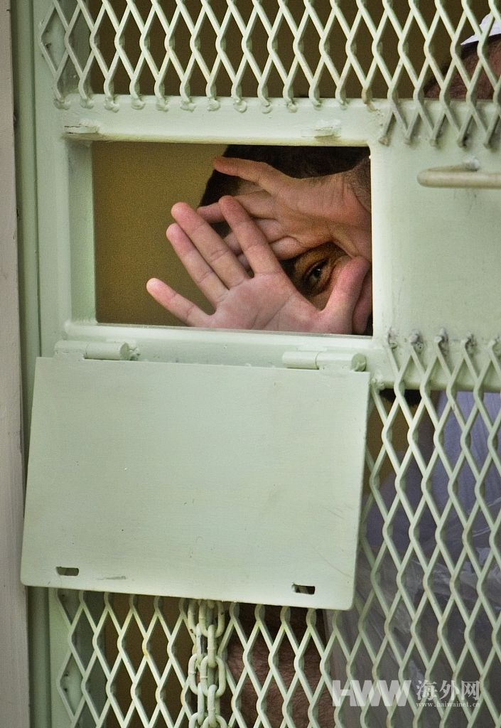 (资料图)当地时间2008年11月18日,古巴关塔那摩湾美国海军基地,美国军方发布的照片显示,Echo营地,一名被关押者透过自己的手从牢房内向外凝视。(图:视觉中国)