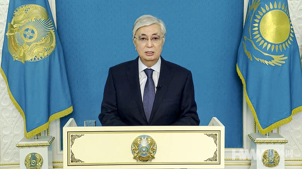 当地时间2022年1月5日,哈萨克斯坦努尔苏丹,哈萨克斯坦总统托卡耶夫就哈国内局势发表全国电视讲话。托卡耶夫表示,阿拉木图的哈安全部队等执法人员遭到暴徒大规模袭击,有人牺牲或者受伤。匪徒还虐待士兵、殴打妇女并掠夺商店。这已经威胁到阿拉木图所有市民的安全。鉴于在该国阿拉木图等多地的局势均很紧张,宣布在这些地区实行紧急状态是一项必要的措施。(图:视觉中国)