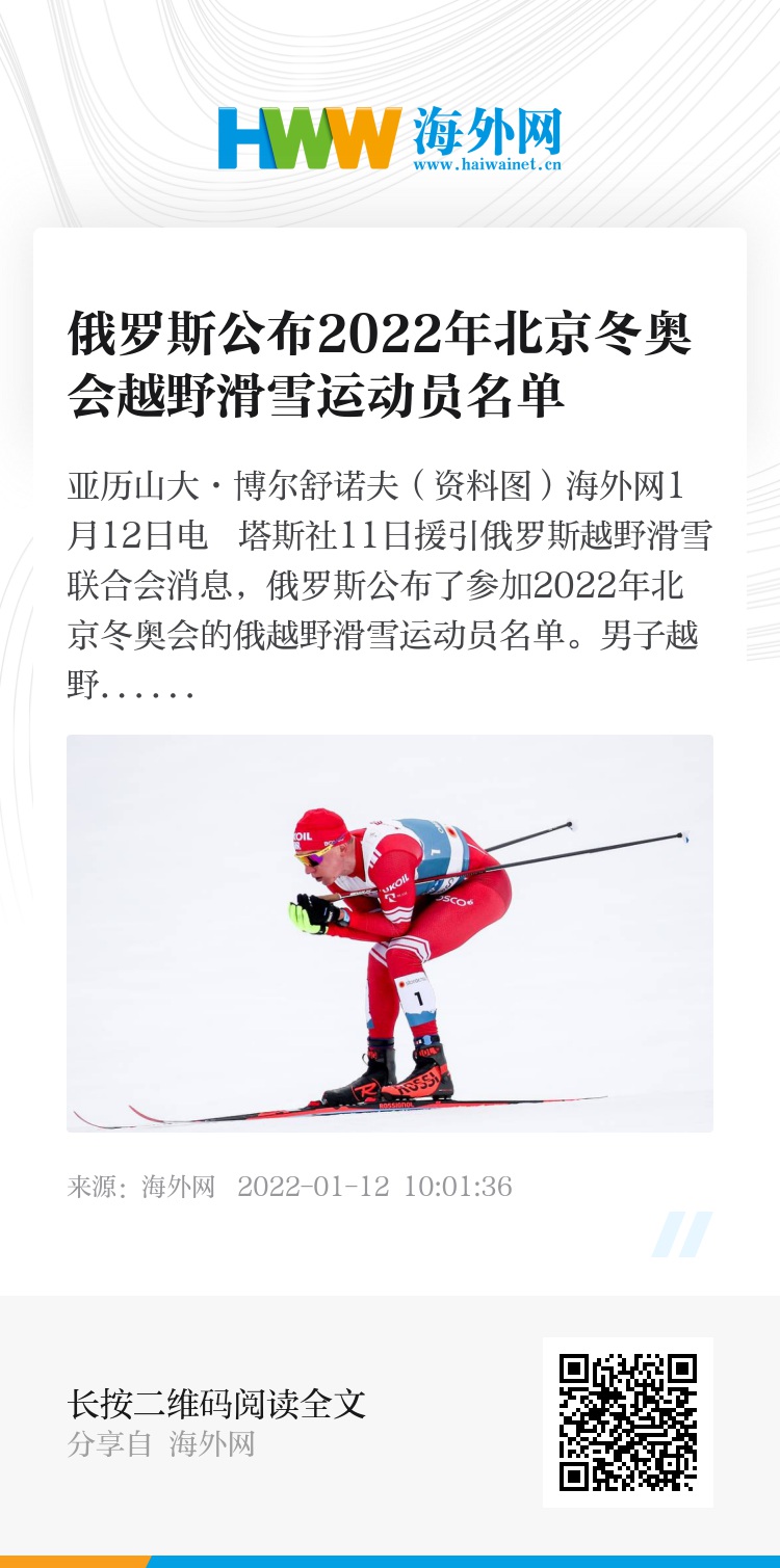 海外网1月12日电 塔斯社11日援引俄罗斯越野滑雪联合会消息,俄罗斯公布了参加2022年北京冬奥会的俄越野滑雪运动员名单。