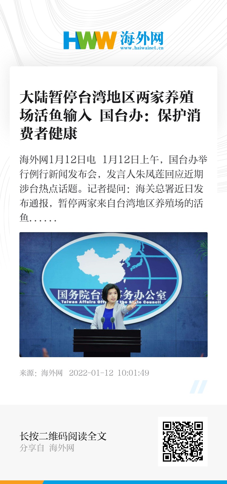 大陆有关部门依法暂停上述台湾地区两家养殖场活鱼输入,目的是保护大陆消费者健康安全,不针对任何养殖户。我们希望台湾地区有关方面加强养殖过程监管,加强对养殖户的辅导,确保输入大陆农渔产品安全。