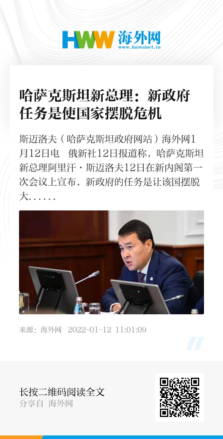 海外网1月12日电 俄新社12日报道称,哈萨克斯坦新总理阿里汗·斯迈洛夫12日在新内阁第一次会议上宣布,新政府的任务是让该国摆脱大规模危机。