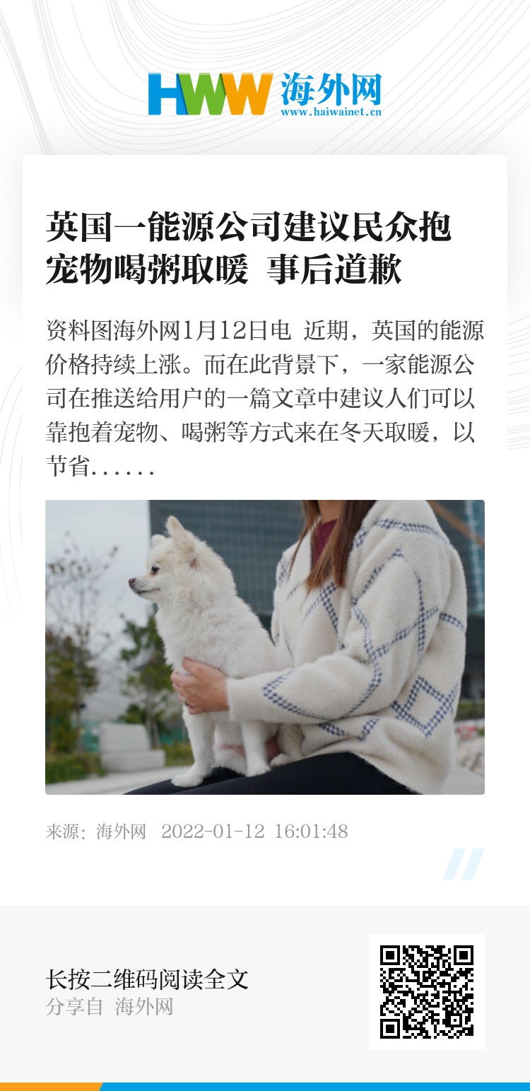 海外网1月12日电 近期,英国的能源价格持续上涨。而在此背景下,一家能源公司在推送给用户的一篇文章中建议人们可以靠抱着宠物、喝粥等方式来在冬天取暖,以节省他们的取暖费,随即引发众怒。随后,这家公司公开道歉。