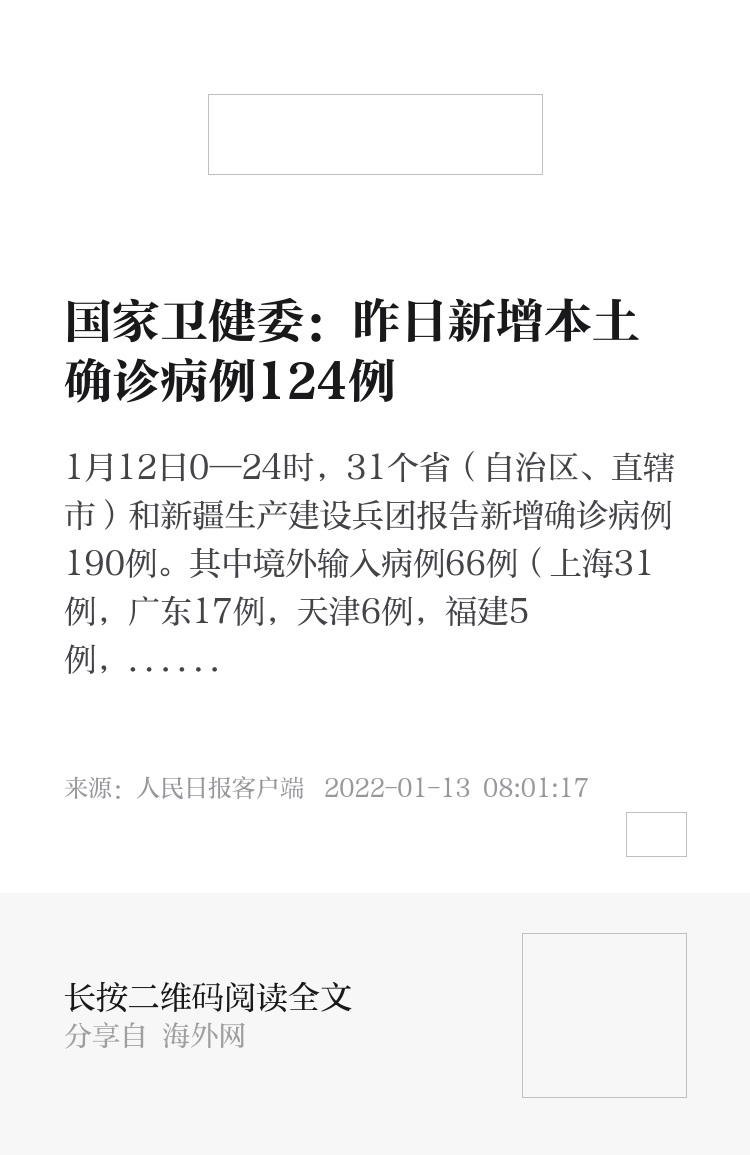1月12日0—24时,31个省(自治区、直辖市)和新疆生产建设兵团报告新增确诊病例190例。其中境外输入病例66例(上海31例,广东17例,天津6例,福建5例,浙江4例,广西2例,北京1例),含6例由无症状感染者转为确诊病例(浙江4例,广东2例);本土病例124例(河南76例,其中安阳市43例、许昌市28例、郑州市3例、信阳市1例、滑县1例;天津41例,其中津南区40例、河西区1例;陕西6例,均在西安市;广东1例,在深圳市)。无新增死亡病例。新增疑似病例9例,均为境外输入病例(均在上海)。