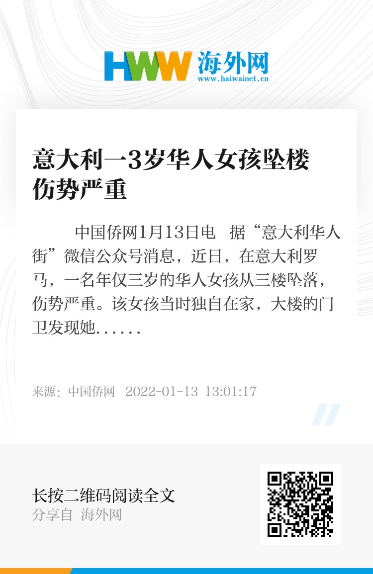 中国侨网1月13日电 据“意大利华人街”微信公众号消息,近日,在意大利罗马,一名年仅三岁的华人女孩从三楼坠落,伤势严重。该女孩当时独自在家,大楼的门卫发现她坠楼并拨打了112报警。紧急报警中心派出一辆救护车来营救女孩。当救护人员到达时,女孩是清醒的。