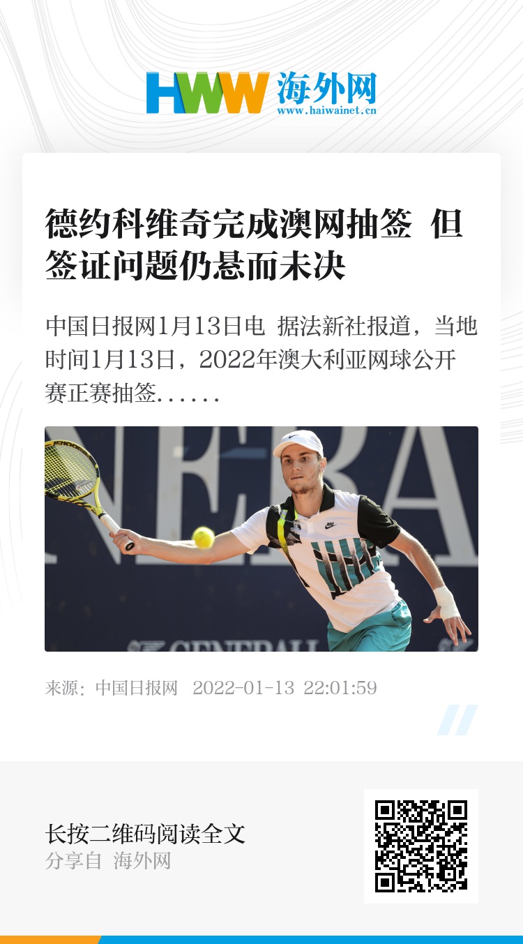 报道称,由于德约科维奇在入境澳大利亚时瞒报了自己过去14天的行程,澳大利亚移民局局长亚历克斯·霍克(Alex Hawke)正在考虑再次取消他的签证并将他驱逐出境。澳网正赛将于1月17日开赛,届时德约科维奇是否还会留在澳大利亚仍悬而未决。