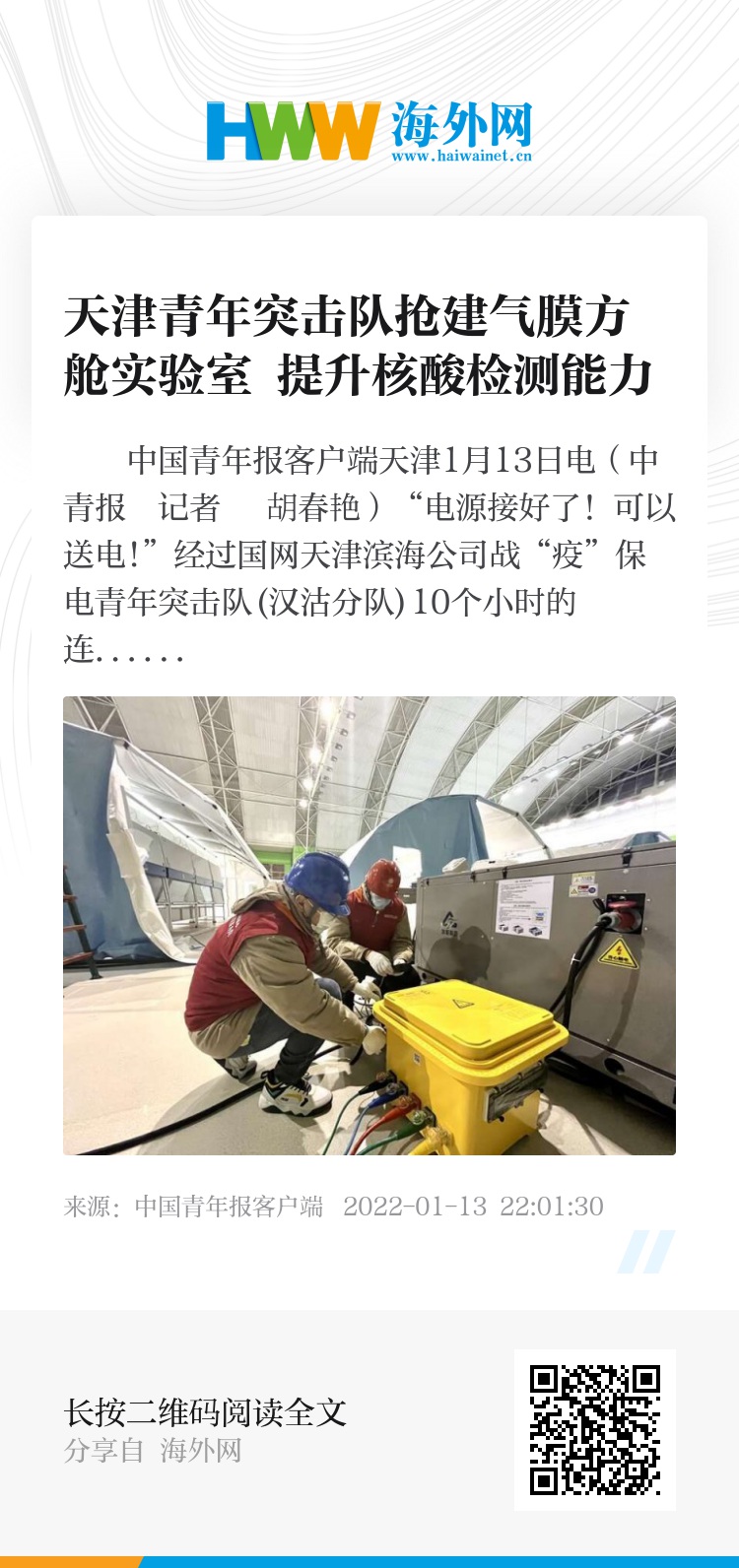 中国青年报客户端天津1月13日电(中青报・中青网记者 胡春艳)“电源接好了!可以送电!”经过国网天津滨海公司战“疫”保电青年突击队(汉沽分队)10个小时的连续奋战,随着队长魏文浩一声令下,低压配电箱电源开关完成合闸,天津市滨海新区汉沽网球馆“迪安雷迪”气膜方舱实验室投入使用,大大提升天津市核酸检测能力。