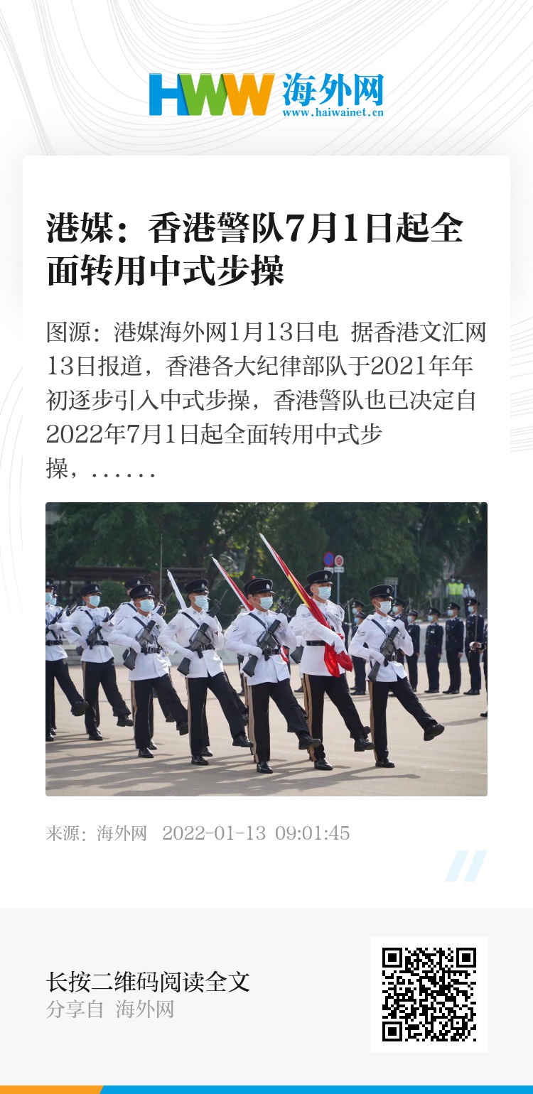 海外网1月13日电 据香港文汇网13日报道,香港各大纪律部队于2021年年初逐步引入中式步操,香港警队也已决定自2022年7月1日起全面转用中式步操,除各典礼仪式及结业会操外,各级人员日常也须遵守敬礼等中式步操礼仪。