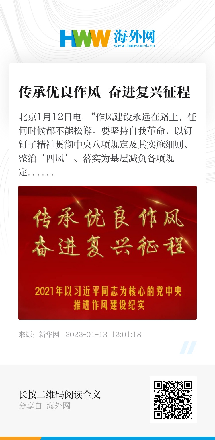 新华社北京1月12日电 “作风建设永远在路上,任何时候都不能松懈。要坚持自我革命,以钉钉子精神贯彻中央八项规定及其实施细则、整治‘四风’、落实为基层减负各项规定,完善长效机制。”