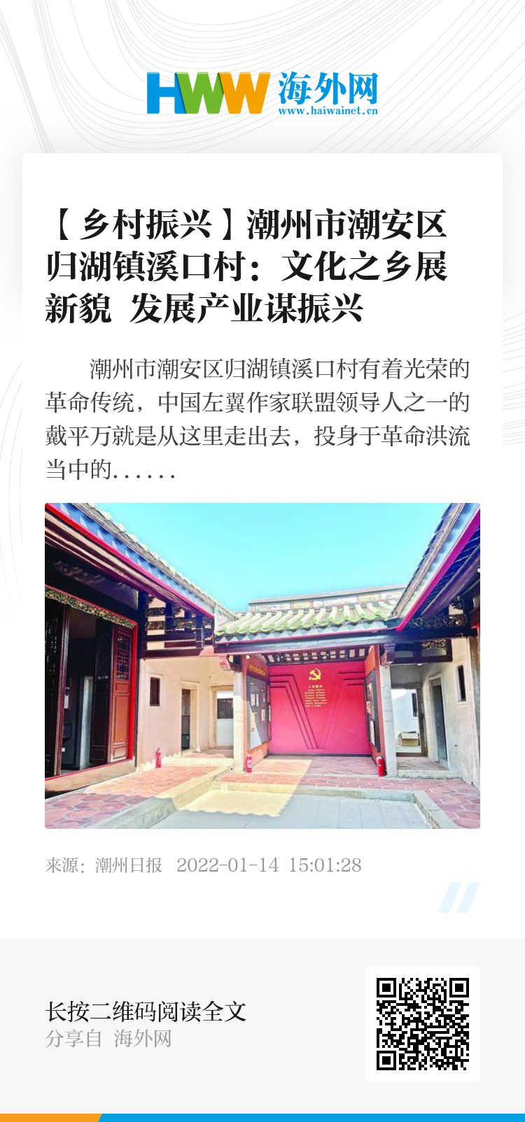 潮州市潮安区归湖镇溪口村有着光荣的革命传统,中国左翼作家联盟领导人之一的戴平万就是从这里走出去,投身于革命洪流当中的。2021年以来,溪口村在全面提升人居环境的同时,成立潮州市溪口农业旅游发展有限公司,大力发展村集体产业,推动乡村全面振兴。