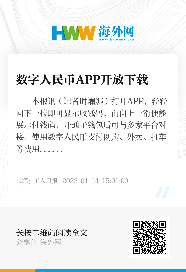 本报讯(记者时斓娜)打开APP,轻轻向下一拉即可显示收钱码,而向上一滑便能展示付钱码,开通子钱包后可与多家平台对接,使用数字人民币支付网购、外卖、打车等费用……近日,数字人民币(试点版)APP在各大应用商店开放下载,深圳、苏州、雄安、成都、上海、海南、长沙、西安、青岛、大连以及冬奥会场景(北京、张家口)等“10+1”试点地区的用户不再需要邀请码即可体验数字人民币。