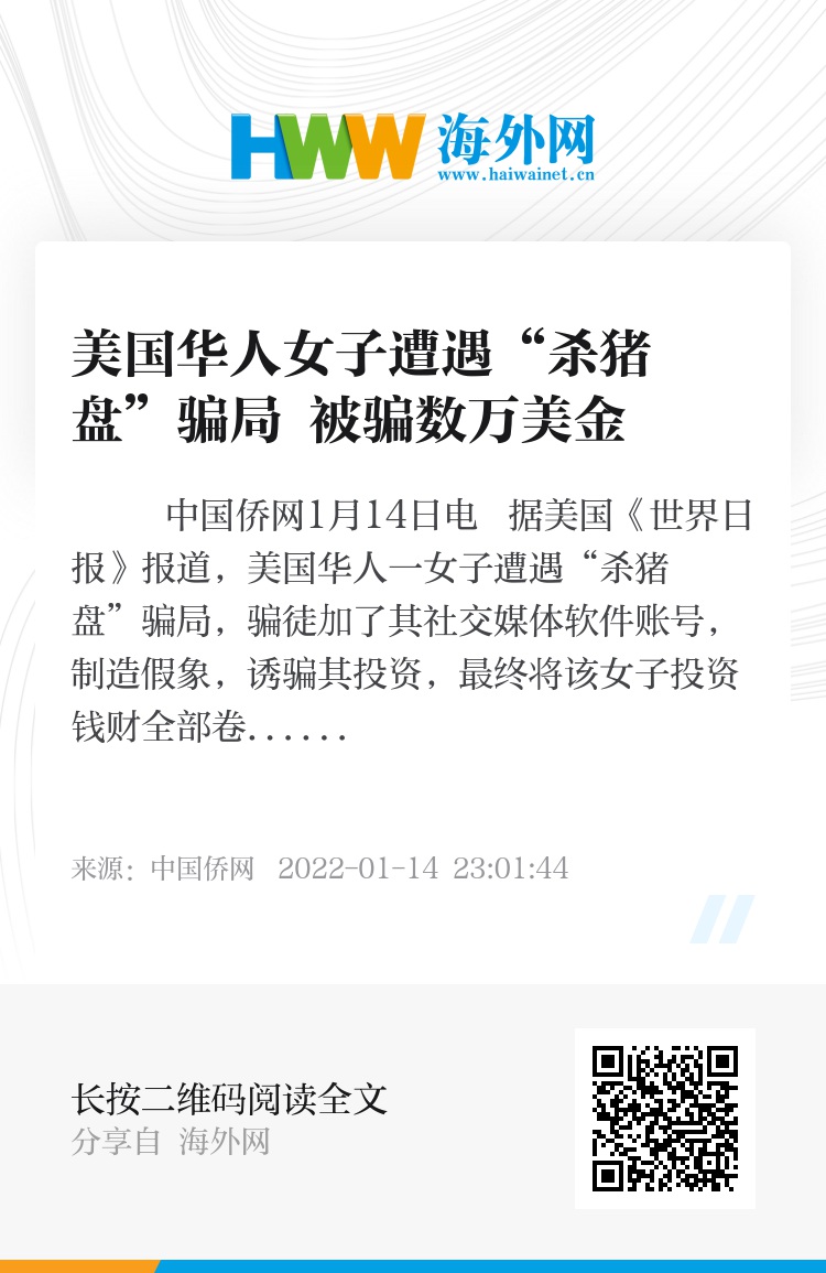 中国侨网1月14日电 据美国《世界日报》报道,美国华人一女子遭遇“杀猪盘”骗局,骗徒加了其社交媒体软件账号,制造假象,诱骗其投资,最终将该女子投资钱财全部卷走。