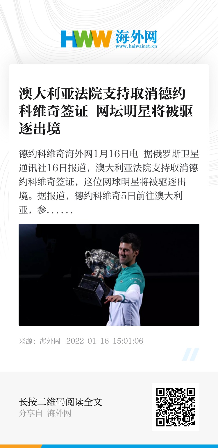 海外网1月16日电 据俄罗斯卫星通讯社16日报道,澳大利亚法院支持取消德约科维奇签证,这位网球明星将被驱逐出境。