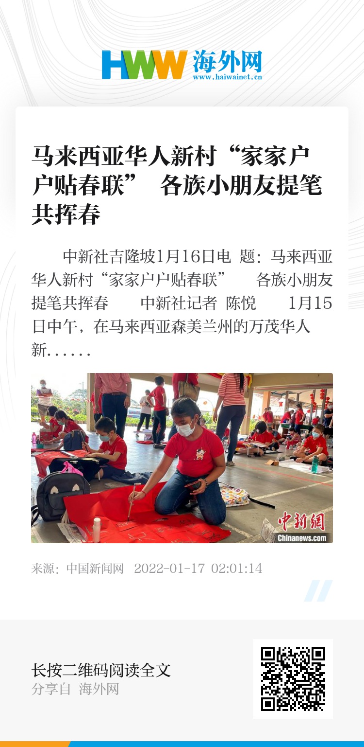 万茂华人新村管理理事会主席郑进蕊告诉中新社记者,当日的小学生写春联比赛,是森美兰中华大会堂和万茂新村等机构联合推出的“家家户户贴春联”活动组成部分。郑进蕊介绍,很多万茂新村住户都一直保持贴春联的习惯。为了方便民众,新村举办此次活动,请来本地书法家现场挥毫,再将写好的春联分发入户,让新村“家家户户贴春联”。