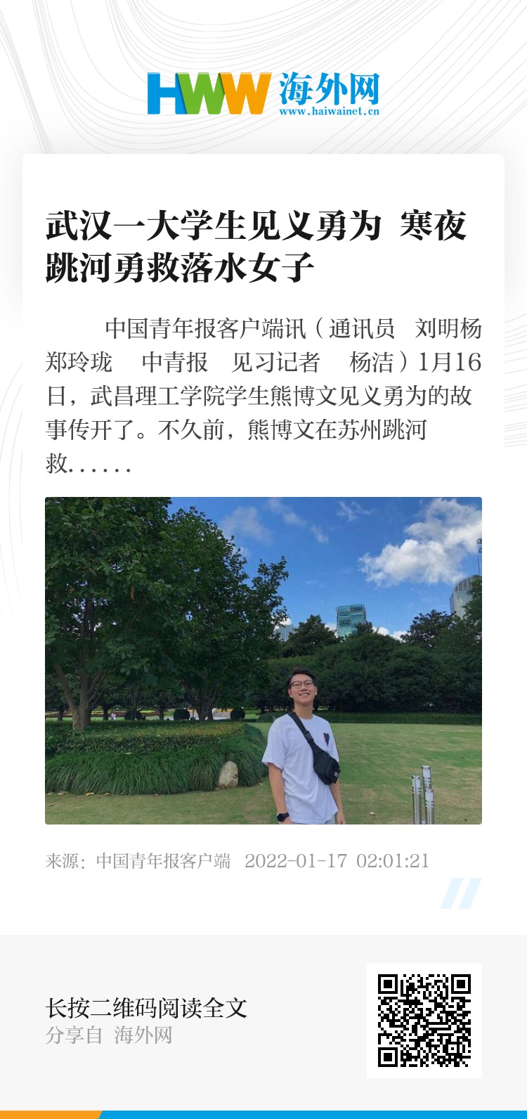中国青年报客户端讯(通讯员 刘明杨 郑玲珑 中青报・中青网见习记者 杨洁)1月16日,武昌理工学院学生熊博文见义勇为的故事传开了。不久前,熊博文在苏州跳河救下一位落水女子,当地派出所正在为他申请“见义勇为奖”。