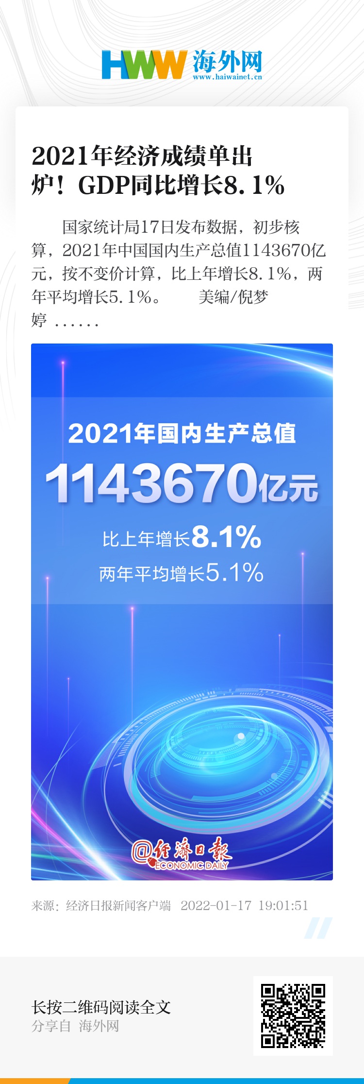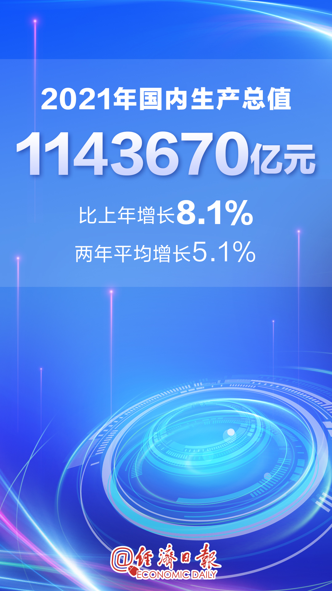 国家统计局17日发布数据,初步核算,2021年中国国内生产总值1143670亿元,按不变价计算,比上年增长8.1%,两年平均增长5.1%。