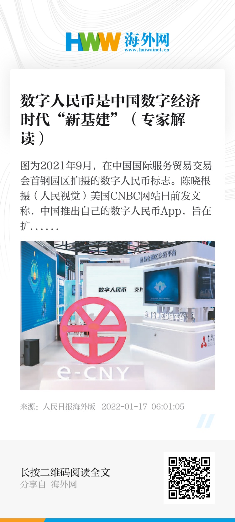 美国CNBC网站日前发文称,中国推出自己的数字人民币App,旨在扩大其应用范围。此前,数字人民币App只供受邀用户下载使用,现在已经在苹果和安卓应用商店上架。目前这款App只对“试点”城市登记用户开放,包括深圳和上海等大都市,也包括北京市及张家口市的“北京冬奥会场景”。
