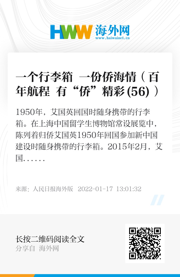 在上海中国留学生博物馆常设展览中,陈列着归侨艾国英1950年回国参加新中国建设时随身携带的行李箱。2015年2月,艾国英把行李箱捐给留学生博物馆时说,当年,美国当局限制中国侨胞中的专家学者回国,她和丈夫好不容易搞到回国的船票。上船前,美国当局对行李的检查非常严格,禁止携带研究资料等,所以同船的100多人,大部分都只拎一个小箱子,装一些随身物品就回国了。