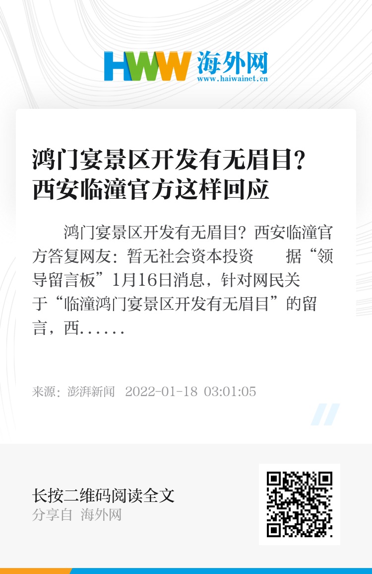 据人民网“领导留言板”1月16日消息,针对网民关于“临潼鸿门宴景区开发有无眉目”的留言,西安市临潼区文旅局回复称,近年来我区积极进行招商引资,改善营商环境,截至目前暂无社会资本投资,因此无法确定开工时间。后续我们将继续加大招商投资工作。