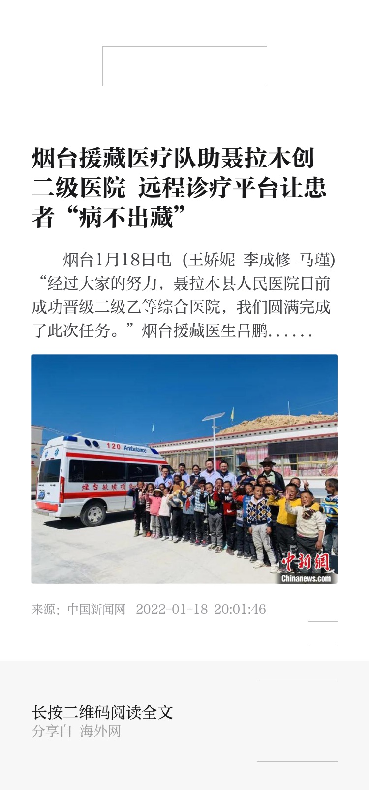 中新网烟台1月18日电 (王娇妮 李成修 马瑾) “经过大家的努力,聂拉木县人民医院日前成功晋级二级乙等综合医院,我们圆满完成了此次任务。”烟台援藏医生吕鹏18日接受记者采访时称。