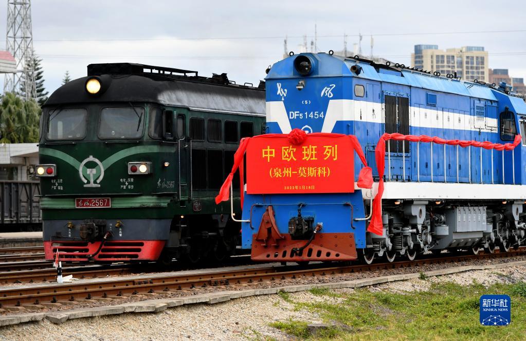 1月18日,中欧班列缓缓驶出泉州东站。当日上午,载有卫生用品、箱包、鞋服及工艺品等货品的中欧班列从泉州东站缓缓驶出,标志着“海丝”起点泉州首次开行中欧班列。此次班列总行程10960公里,从泉州东站始发,经由满洲里站出境,预计20天后抵达俄罗斯莫斯科。此次班列搭载50个40英尺货柜,总重约445吨,总货值约1037万元。新华社记者魏培全摄