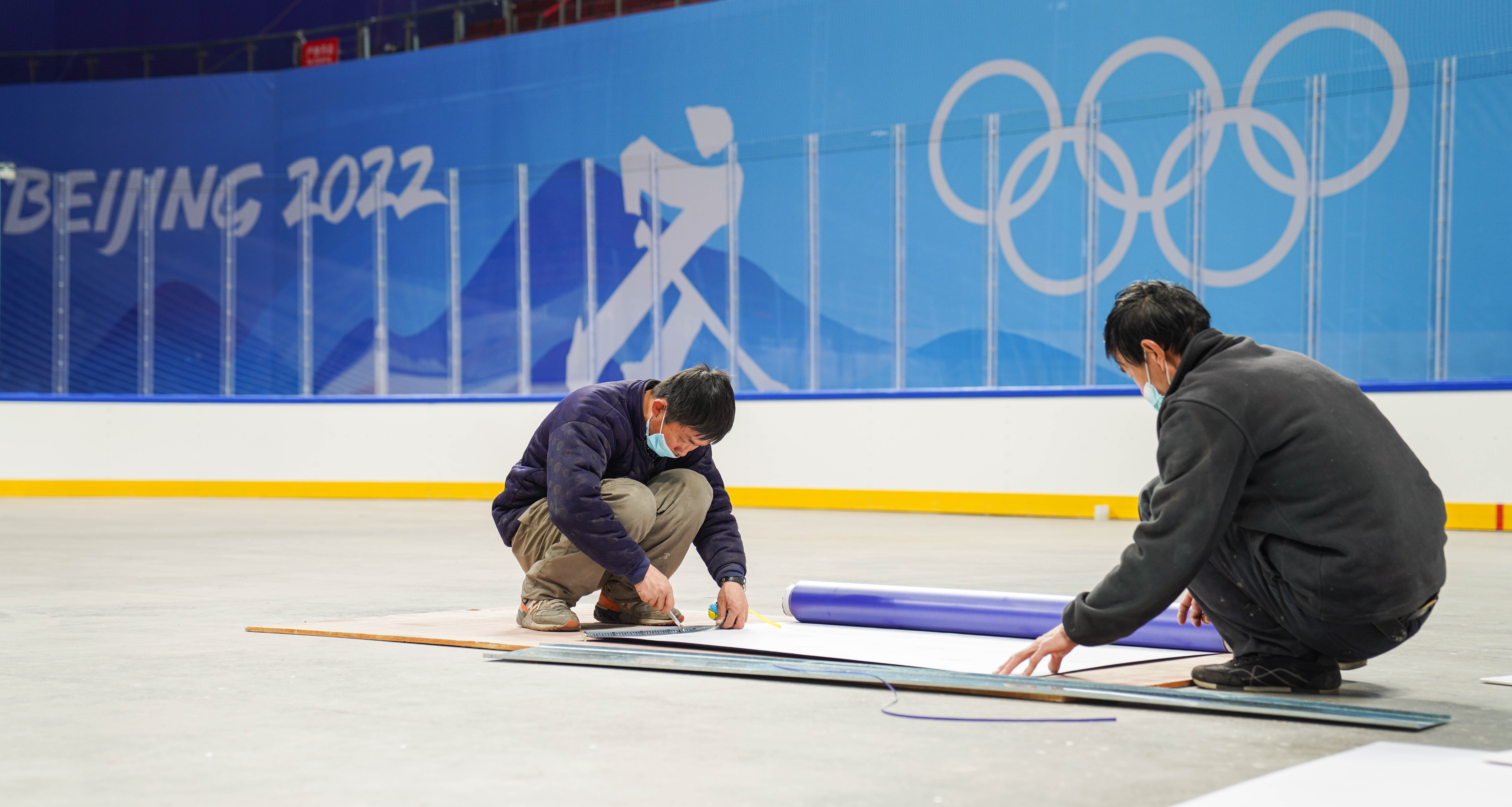北京五棵松体育馆,北京2022冬奥会场馆形象景观布置进入尾声阶段。图为工人师傅们在做最后准备工作。图片来源:IC photo