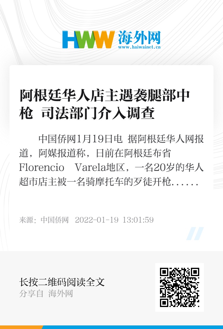 中国侨网1月19日电 据阿根廷华人网报道,阿媒报道称,日前在阿根廷布省Florencio Varela地区,一名20岁的华人超市店主被一名骑摩托车的歹徒开枪击中腿部。司法部门目前已介入调查,警方也对歹徒展开追捕。