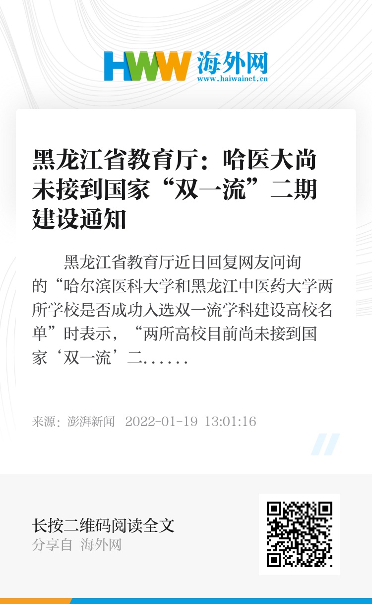 黑龙江省教育厅近日回复网友问询的“哈尔滨医科大学和黑龙江中医药大学两所学校是否成功入选双一流学科建设高校名单”时表示,“两所高校目前尚未接到国家‘双一流’二期建设的相应通知”。