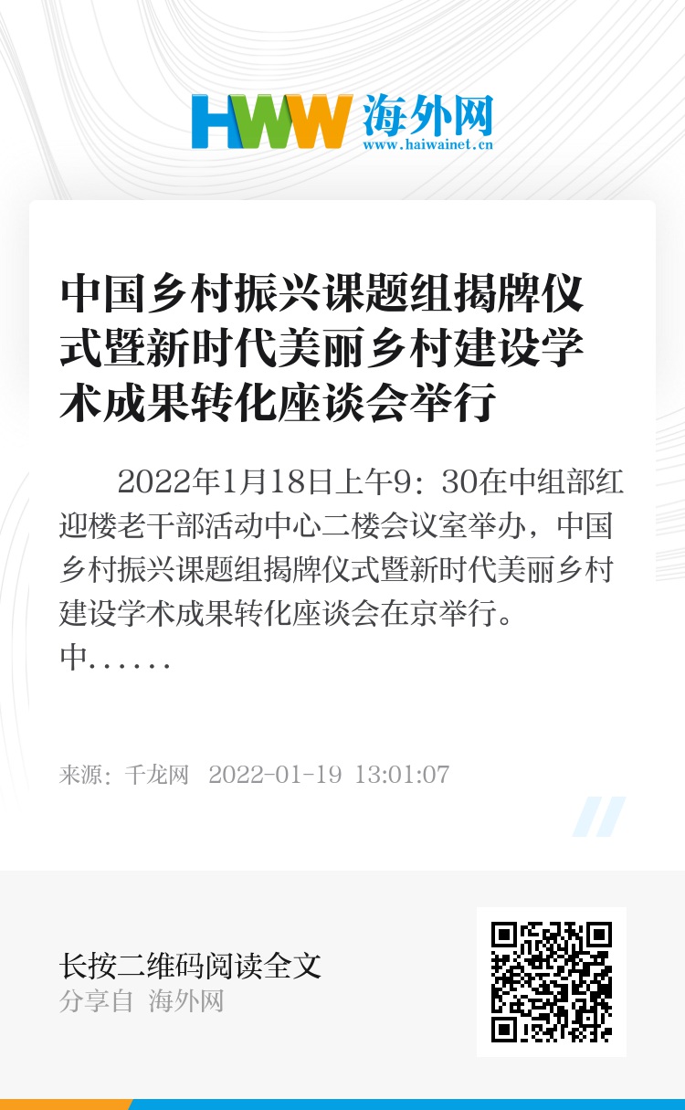 2022年1月18日上午9:30在中组部红迎楼老干部活动中心二楼会议室举办,中国乡村振兴课题组揭牌仪式暨新时代美丽乡村建设学术成果转化座谈会在京举行。