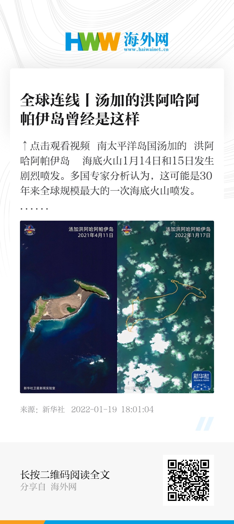 南太平洋岛国汤加的洪阿哈阿帕伊岛海底火山1月14日和15日发生剧烈喷发。多国专家分析认为,这可能是30年来全球规模最大的一次海底火山喷发。