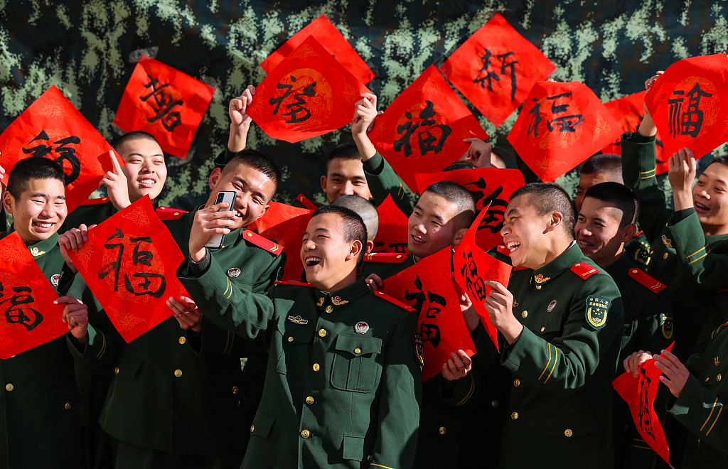 2022年1月18日,甘肃酒泉,武警甘肃总队酒泉支队瓜州中队官兵们自己动手,写春联和福字,在感受传统文化魅力的同时,为远方的亲人置办“不一样的年货”,向家人送上一份特别的新春“大礼包”。图源:人民视觉