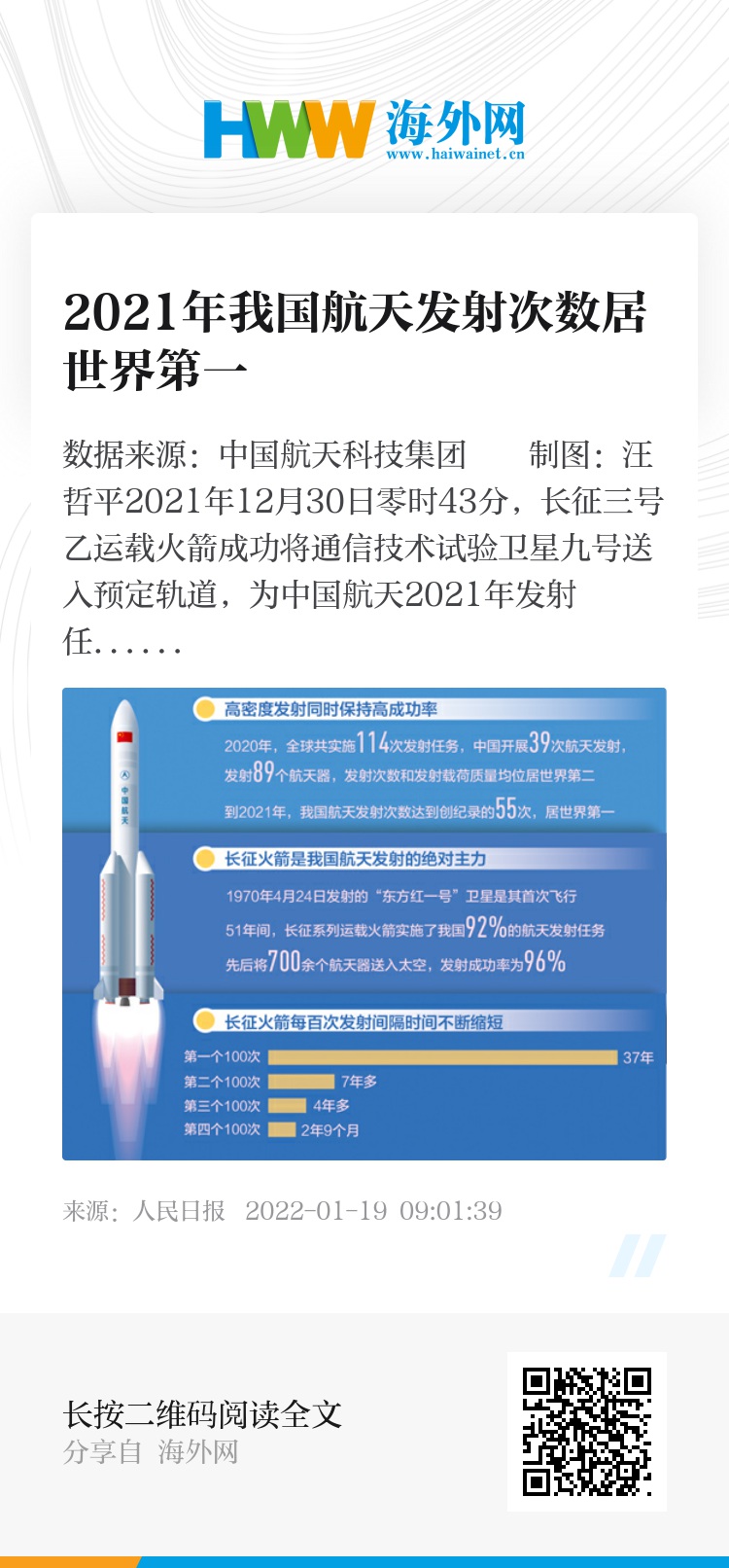2021年,中国航天发射次数创新高。包括长征系列火箭、快舟系列火箭和民营航天企业研制的火箭在内,全年共实施55次发射任务,将上百颗(含搭载)航天器送入太空。