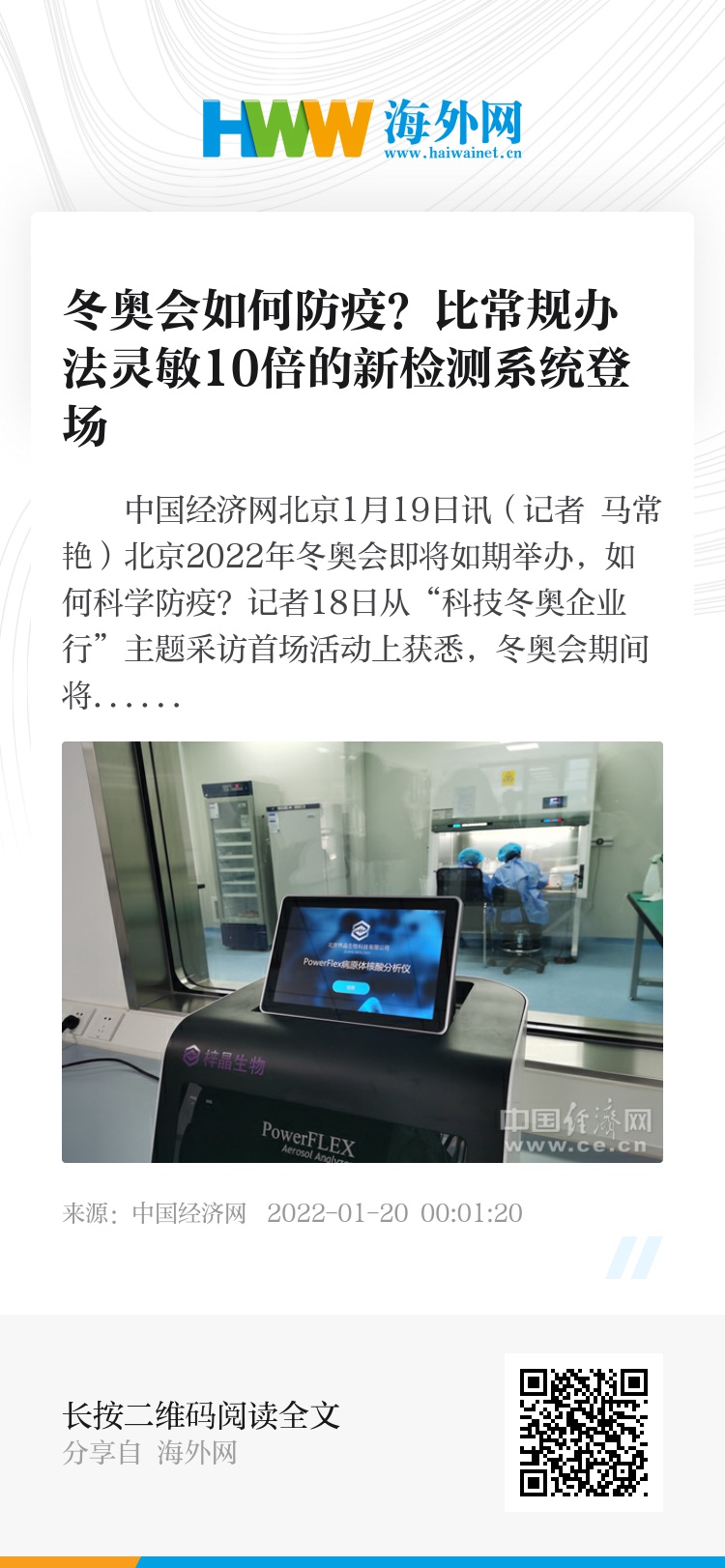 中国经济网北京1月19日讯(记者 马常艳)北京2022年冬奥会即将如期举办,如何科学防疫?记者18日从“科技冬奥企业行”主题采访首场活动上获悉,冬奥会期间将推进在奥运场馆的气溶胶新冠病毒核酸检测。