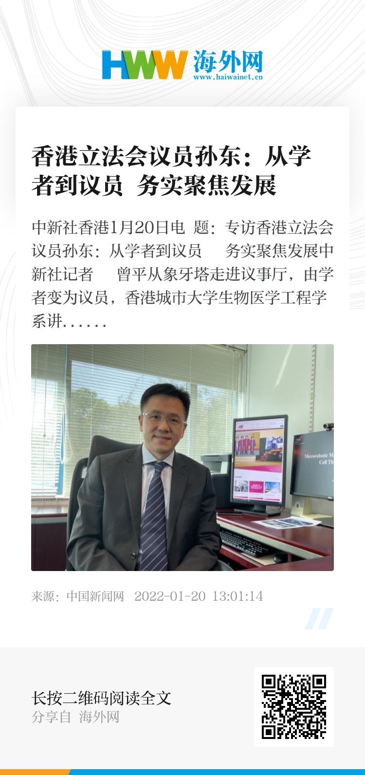 从象牙塔走进议事厅,由学者变为议员,香港城市大学生物医学工程学系讲座教授、香港特区立法会新任议员孙东的跨界生涯刚刚开启。“我希望把理性和务实、协同和创新带到立法会,新的立法会要聚焦发展。”这位来自学术界的新晋议员近日接受中新社记者专访时如是说。
