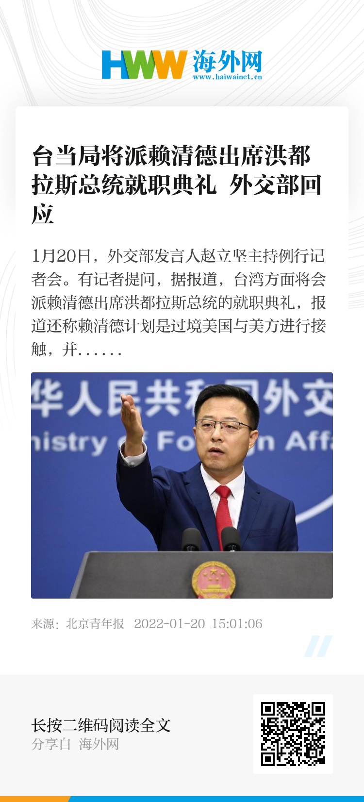 “我们敦促美方恪守一个中国原则和中美三个联合公报规定,严肃对待中方立场和关切,不与台湾进行任何形式的官方接触,不向台独势力发出任何错误信号。”赵立坚强调。