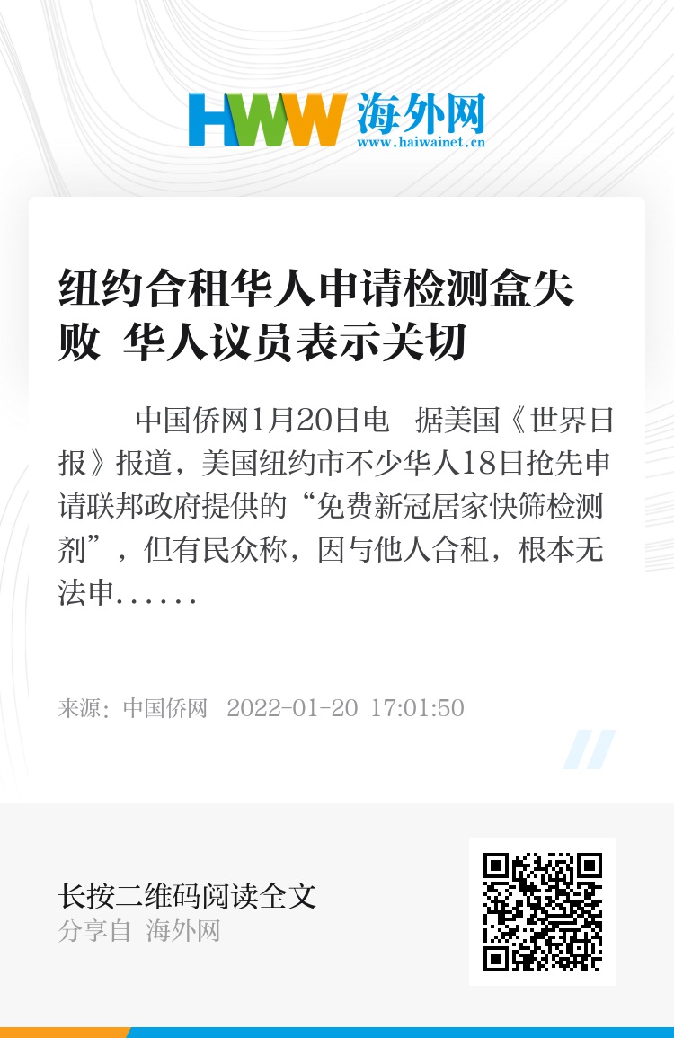 中国侨网1月20日电 据美国《世界日报》报道,美国纽约市不少华人18日抢先申请联邦政府提供的“免费新冠居家快筛检测剂”,但有民众称,因与他人合租,根本无法申请到检测盒。国会众议员孟昭文和市议员黄敏仪对此表示关切。