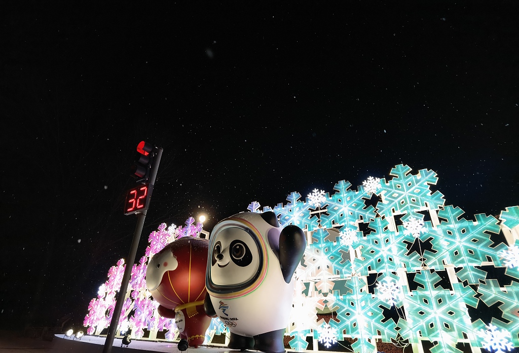 1月20日,北京迎全市范围降雪。雪中的冬奥吉祥物。图片来源:视觉中国