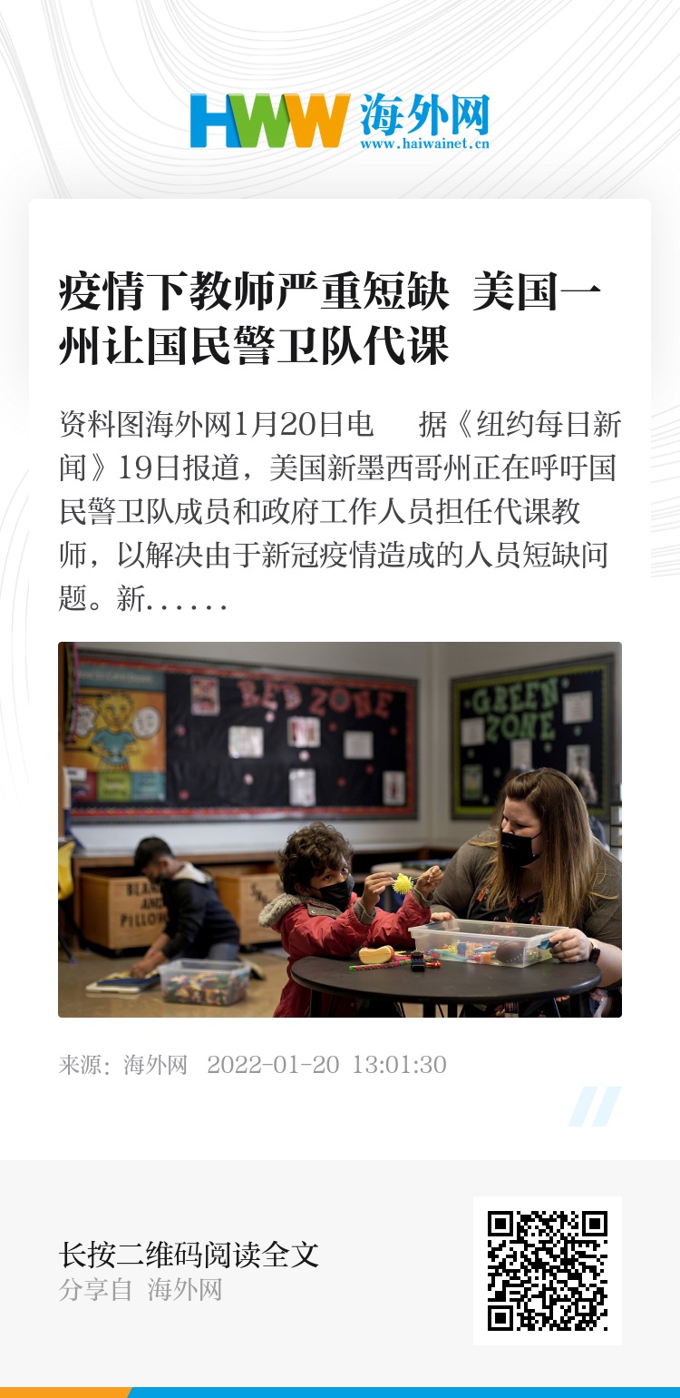 海外网1月20日电 据《纽约每日新闻》19日报道,美国新墨西哥州正在呼吁国民警卫队成员和政府工作人员担任代课教师,以解决由于新冠疫情造成的人员短缺问题。