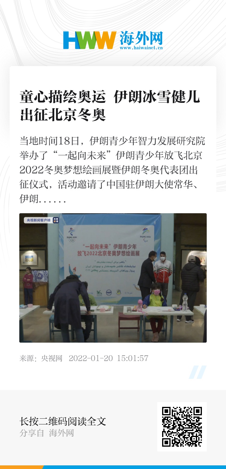 当地时间18日,伊朗青少年智力发展研究院举办了“一起向未来”伊朗青少年放飞北京2022冬奥梦想绘画展暨伊朗冬奥代表团出征仪式,活动邀请了中国驻伊朗大使常华、伊朗体育与青年部部长萨贾迪、教育部副部长阿克巴尔扎德、伊朗奥委会主席萨利希等为伊朗奥运健儿送行。