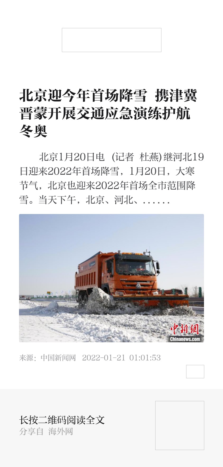 中新网北京1月20日电 (记者 杜燕)继河北19日迎来2022年首场降雪,1月20日,大寒节气,北京也迎来2022年首场全市范围降雪。当天下午,北京、河北、天津、山西、内蒙古五个省份联动开展“迎战冬奥·2022——北京冬奥会极端天气交通运输应急联动综合保障演练”。