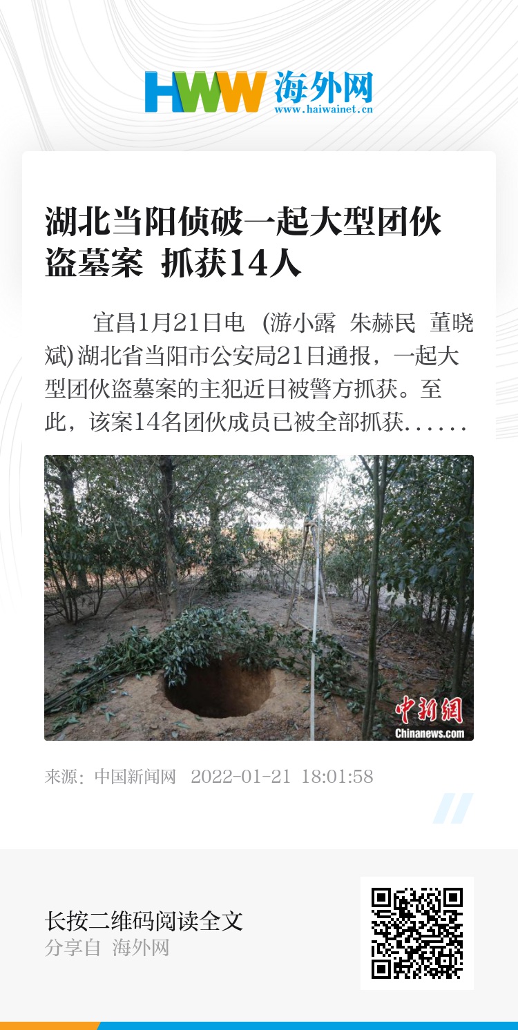 中新网宜昌1月21日电 (游小露 朱赫民 董晓斌)湖北省当阳市公安局21日通报,一起大型团伙盗墓案的主犯近日被警方抓获。至此,该案14名团伙成员已被全部抓获,案件宣告侦破。