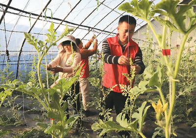 近来,江苏省东台市国家现代农业产业园种植的冬季西瓜开始开花坐果。园区管理团队组织技术骨干走进温室大棚,指导瓜农整枝打杈、人工授粉,实行精准管护。练益华摄(人民视觉)