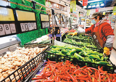 2021年全年,全国居民消费价格指数(CPI)比上年上涨0.9%,低于全年3%左右的预期目标。图为近日,在江西省吉安市峡江县一家超市,售货员在整理货架。陈福平摄(人民视觉)